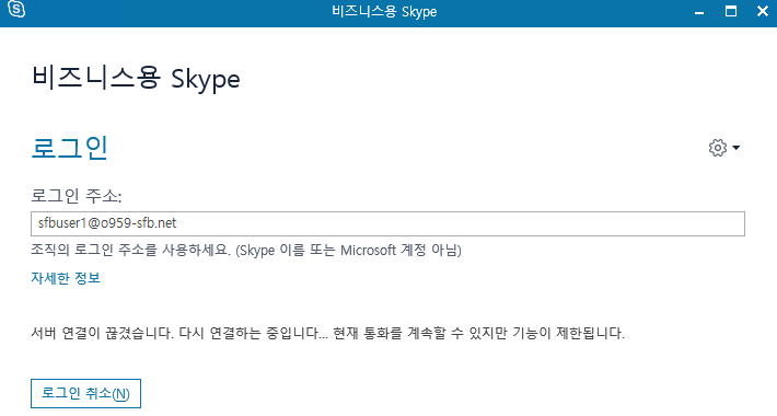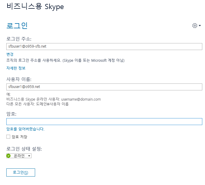 현재 상태론 위 화면과 같이 로그인 주소에는 Skype For Business 서버에 설정한 사용자 로그인 주소를 입력해야 하고