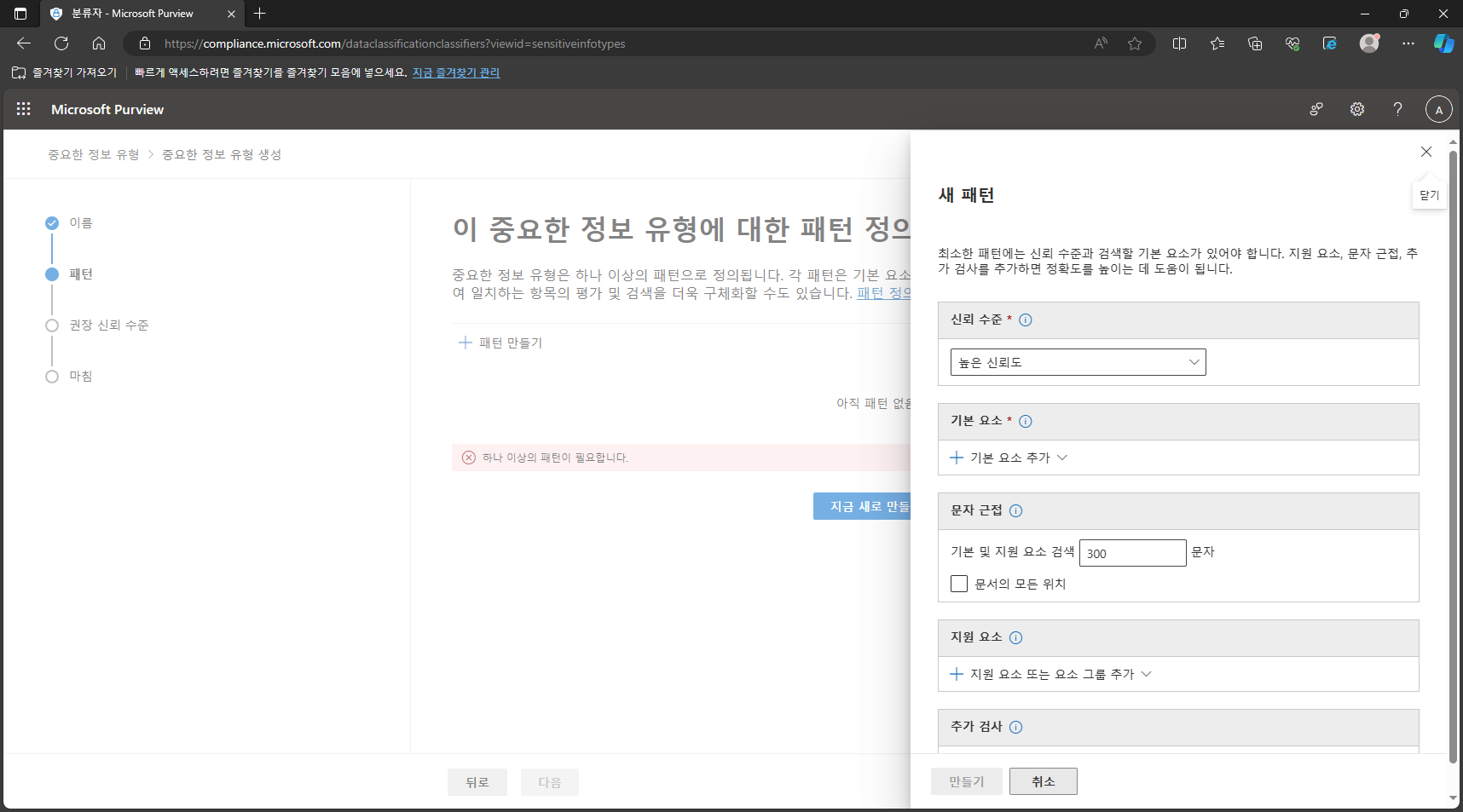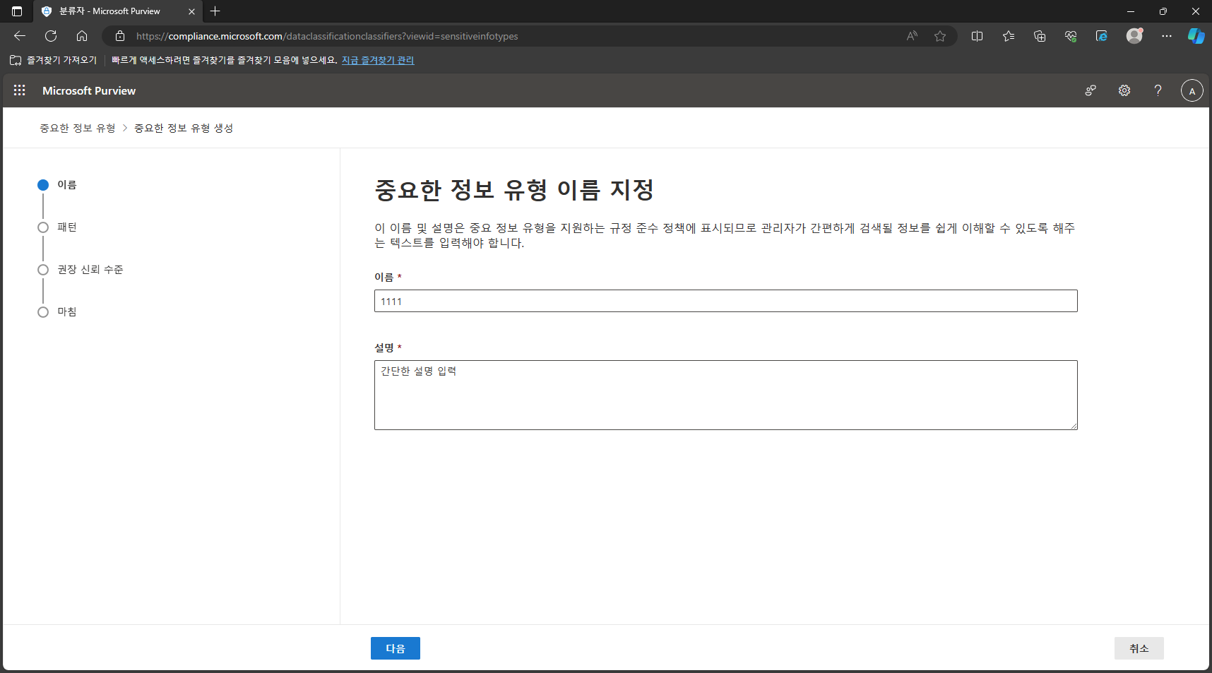 나머지 설정은 그대로 둔체 완료 클릭 후 다음 다음을 눌러 중요한 정보 유형 생성을 마무리 해주세요