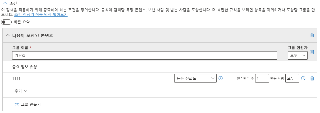 추가 클릭 - 중요 정보 유형 - 1111 선택DLP 정책 생성 - 조건