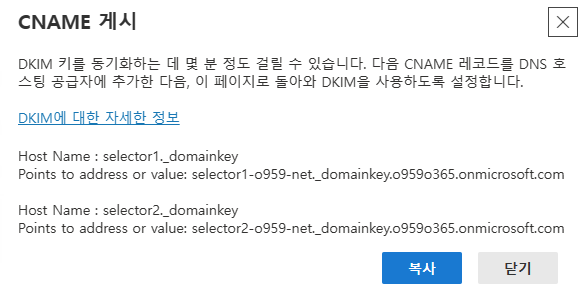 [DKIM 키를 생성할 도메인 클릭] - [DKIM 키 만들기]를 클릭해주세요