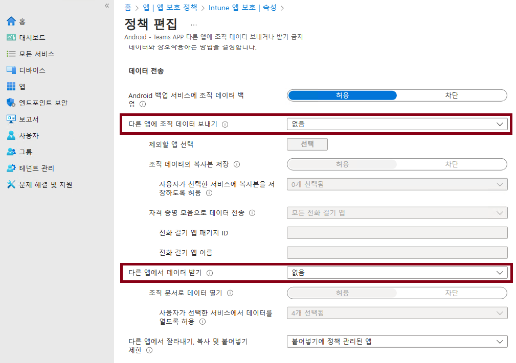 정책 중에서 "다른 앱에 조직 데이터 보내기"와 "다른 앱에서 데이터 받기"를