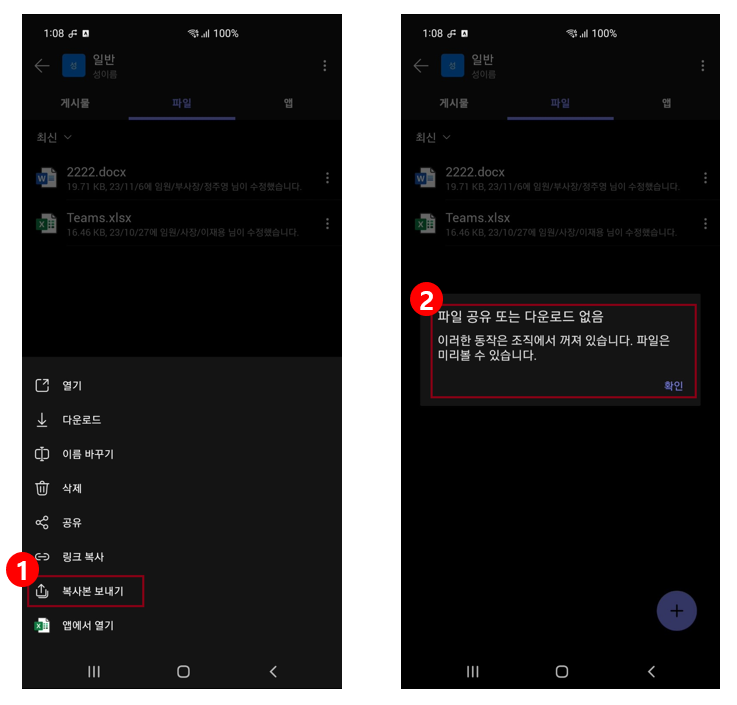Teams APP에서 파일 다운로드 및 데이터 보내기 받기 금지