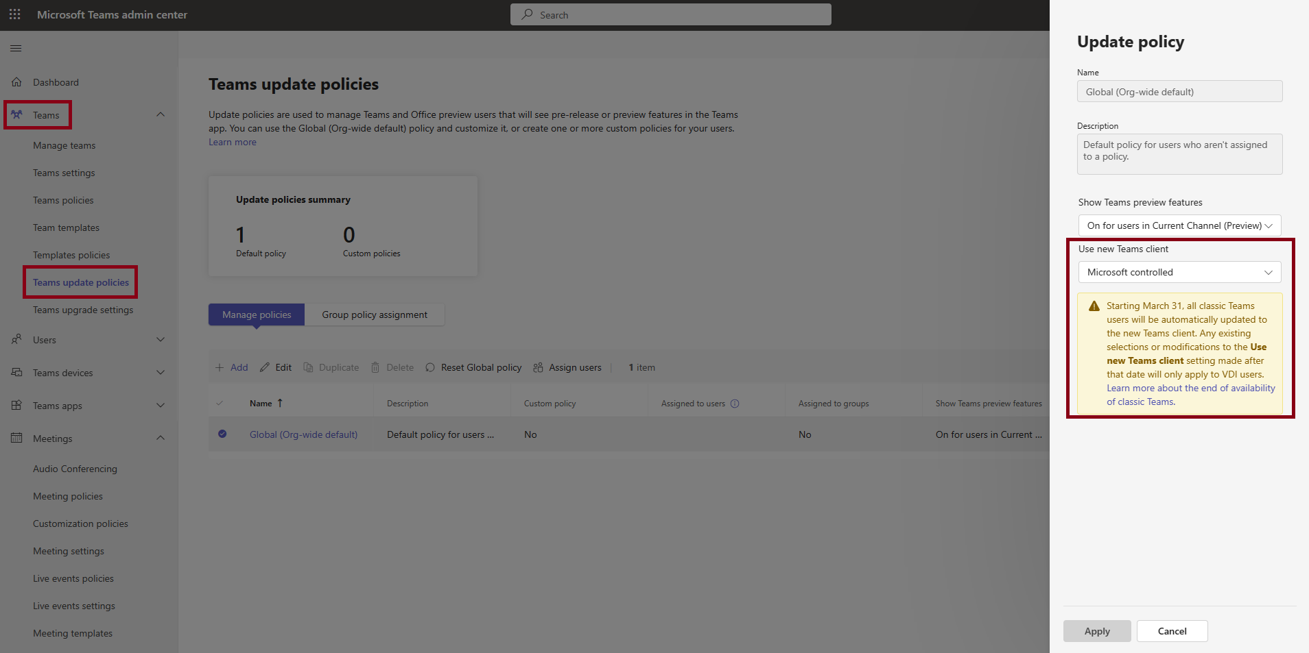 팀즈 관리 센터 - Teams - Teams Update Policy 접속해서